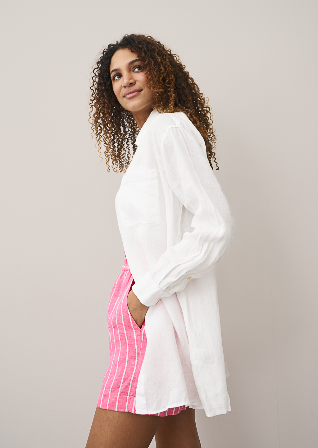 Corte recto y largo Cuello camisero Tapeta de botones abierta y continua Mangas largas con puños de dos botones Bolsillo en el pecho Lino.