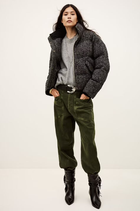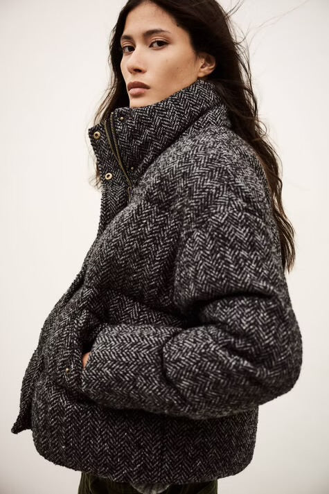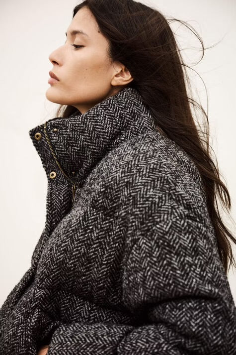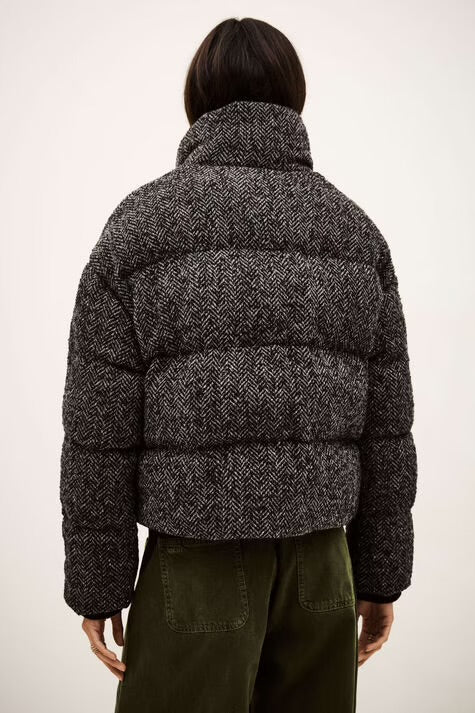 - Forma de chaqueta acolchada - Corte recto y corto - Acolchado - Cuello alto - Cierre de cremallera y botones a presión - Bolsillos con solapa y botones a presión