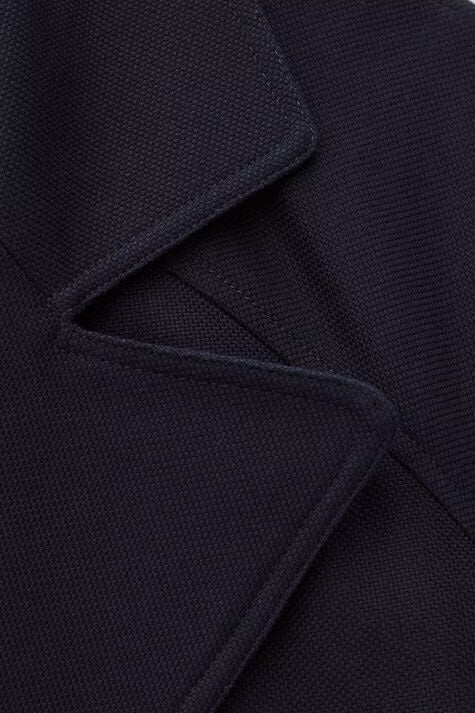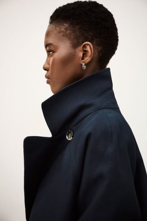 - Largo corto - Corte recto y holgado - Cuello ancho - Botonadura cruzada - Pliegue en la espalda - Logotipo en la espalda