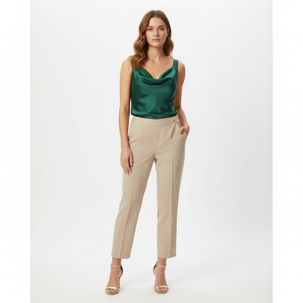 CAMERON de corte cropped. El ligero poliéster bielástico garantiza una sensación suave y agradable al tacto. Gracias a su principio de fácil cuidado, estos pantalones son fáciles de usar a diario y especialmente fáciles de cuidar. La cinturilla elástica proporciona un ajuste cómodo, mientras que el sutil logotipo de CAMBIO en la parte delantera le da un toque de estilo. Disponible en blanco roto y marrón. Pantalones cropped de corte ancho con cinturilla elástica. Tiro: Moda. Largo: 68 cm. Microestructura elástica de poliéster. 90 % poliéster, 10 % poliuretano.