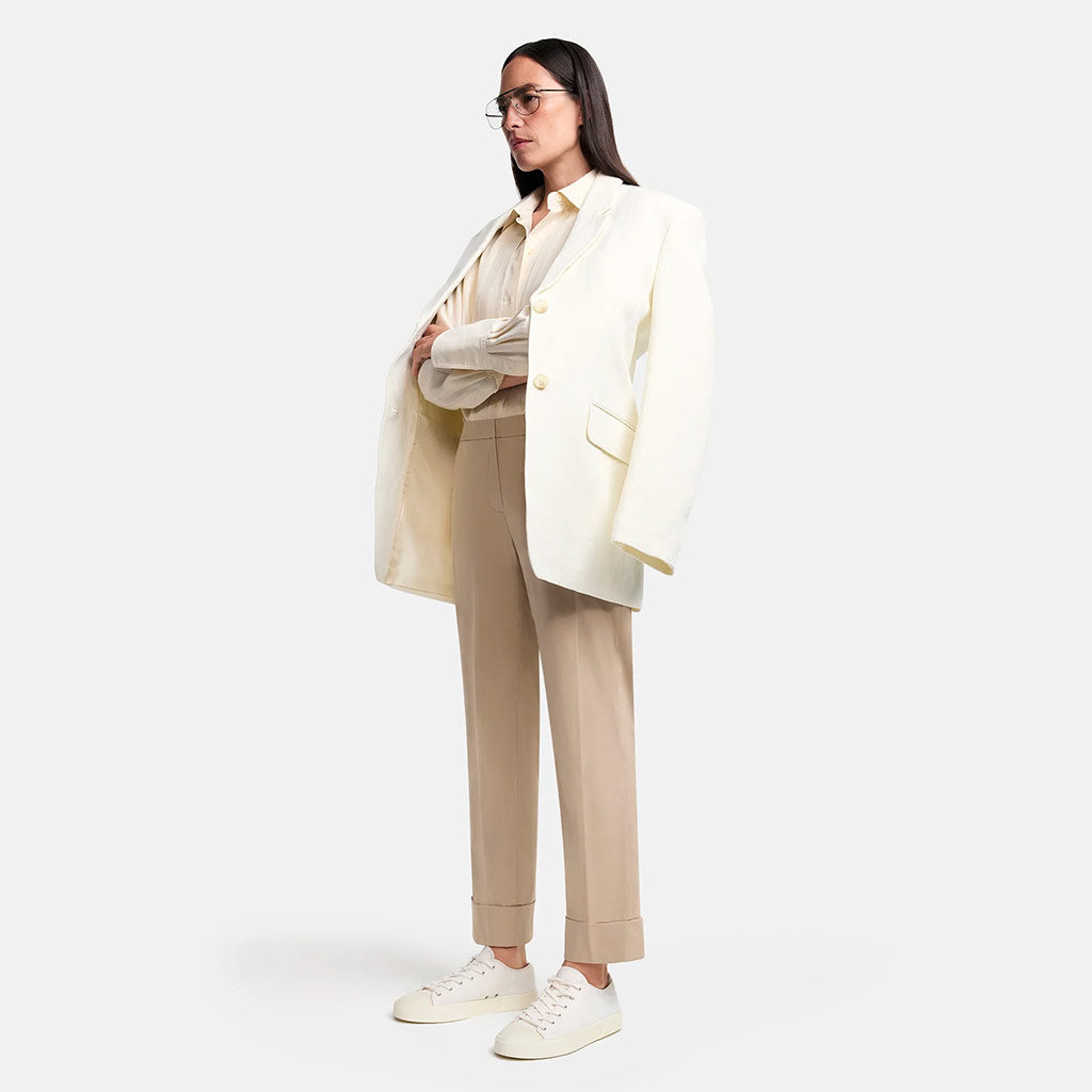 Pantalones cropped KRYSTAL con un moderno corte zanahoria. La mezcla de algodón de alta calidad es ligera y ofrece un ajuste óptimo. Estos pantalones son la base perfecta para looks elegantes y con clase. Disponibles en azul marino y arena. Pantalones cropped con corte zanahoria Altura de la cintura: Moda Largo: 68 cm Algodón técnico Papertouch 76 % algodón, 21 % poliamida, 3 % elastano.