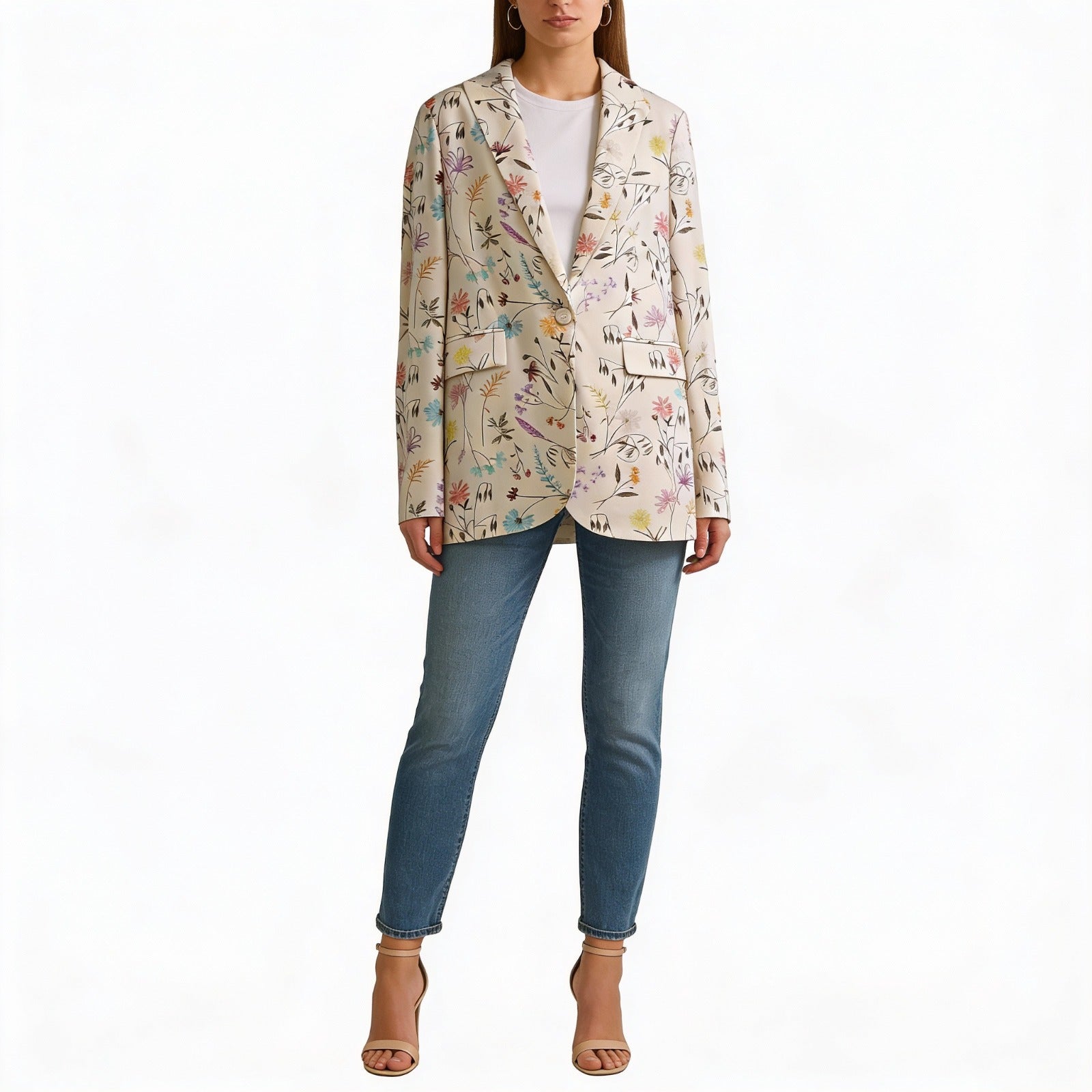 Blazer estampado floral con cierre botón y bolsillos plastón delanteros.