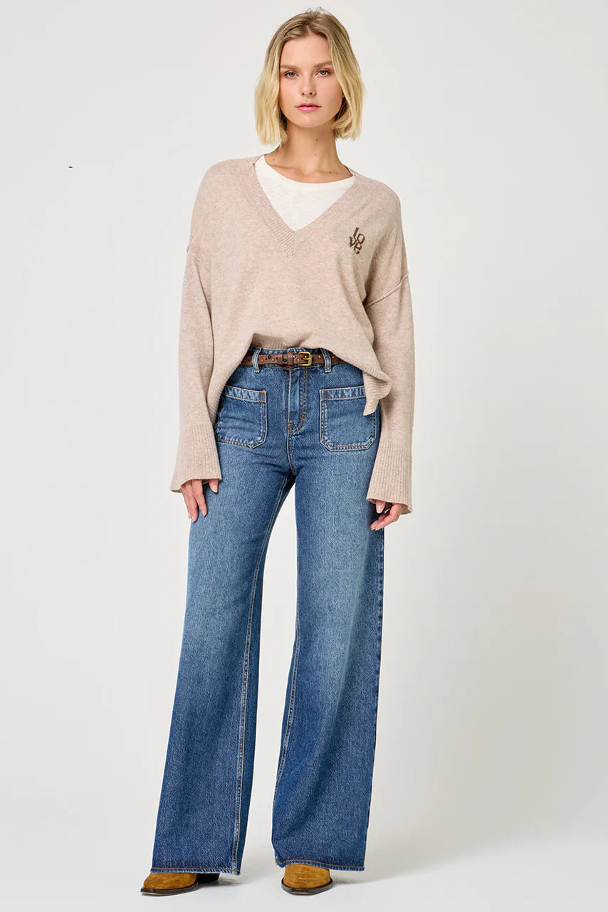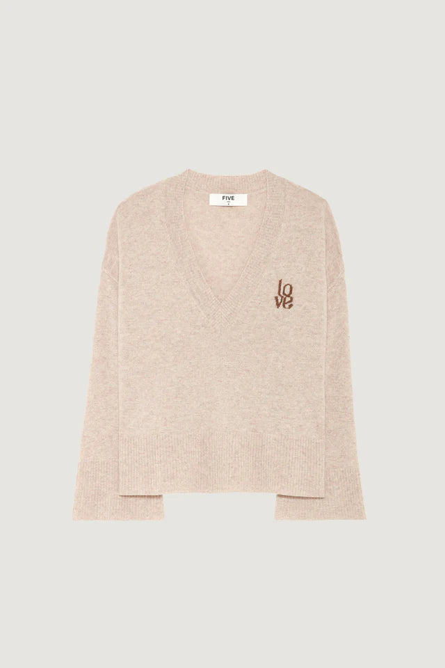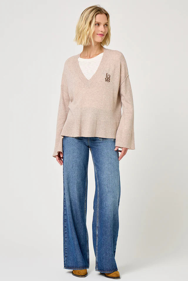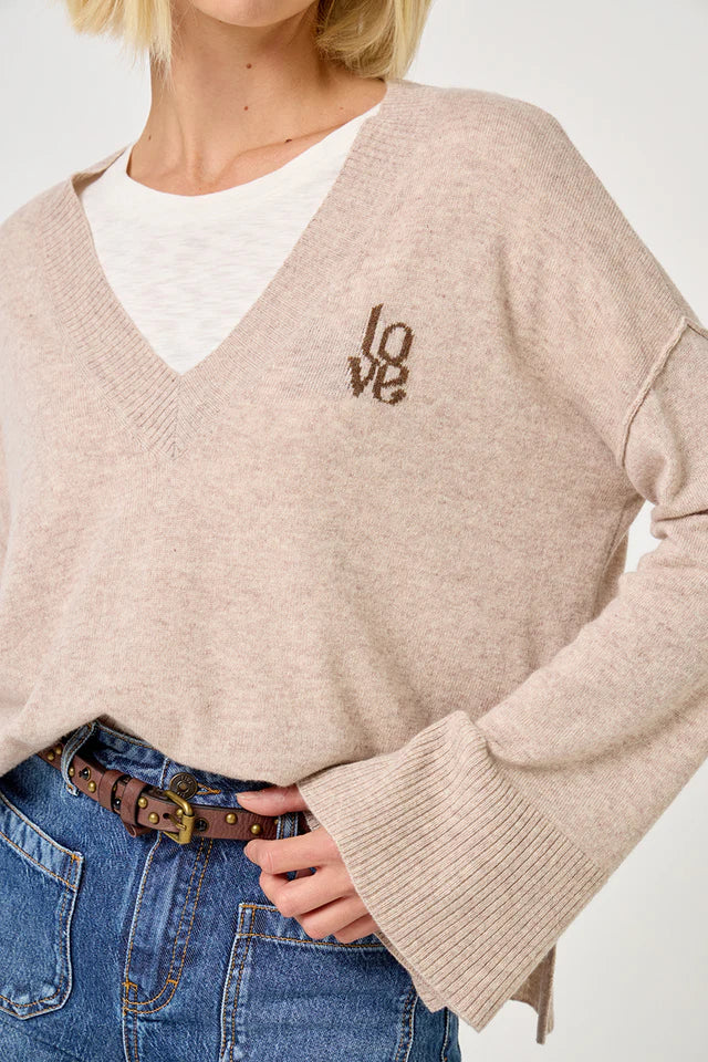 Un básico de lujo con mensaje sutil. Este jersey de escote en V está confeccionado en una exquisita mezcla de 90% lana y 10% cachemira, logrando una textura ultrasuave y una caída ligera. El detalle de intarsia con la palabra “love” bordada en el pecho le aporta un toque personal y contemporáneo.