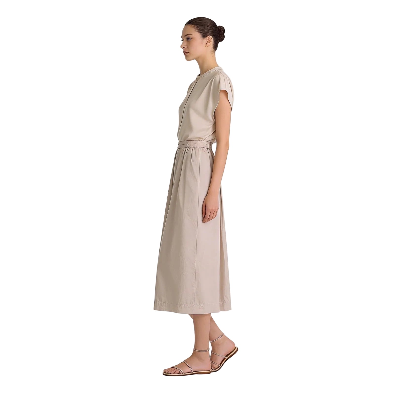 Falda midi, goma en cintura, ranuras cinturón y bolsillos laterales.
