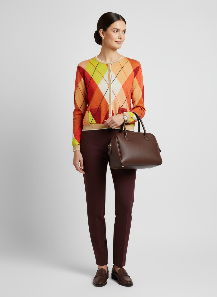 Este sofisticado cardigan presenta un clásico diseño argyle reinterpretado en tonos cálidos de naranja, burdeos, lima y crema. Confeccionado en 100% lana merino, ofrece una textura suave y ligera, ideal para el entretiempo. Su corte ajustado y botones frontales aportan un aire pulido y femenino, perfecto para combinar con pantalones de vestir o faldas midi. Un toque moderno y vibrante que renueva la elegancia tradicional.