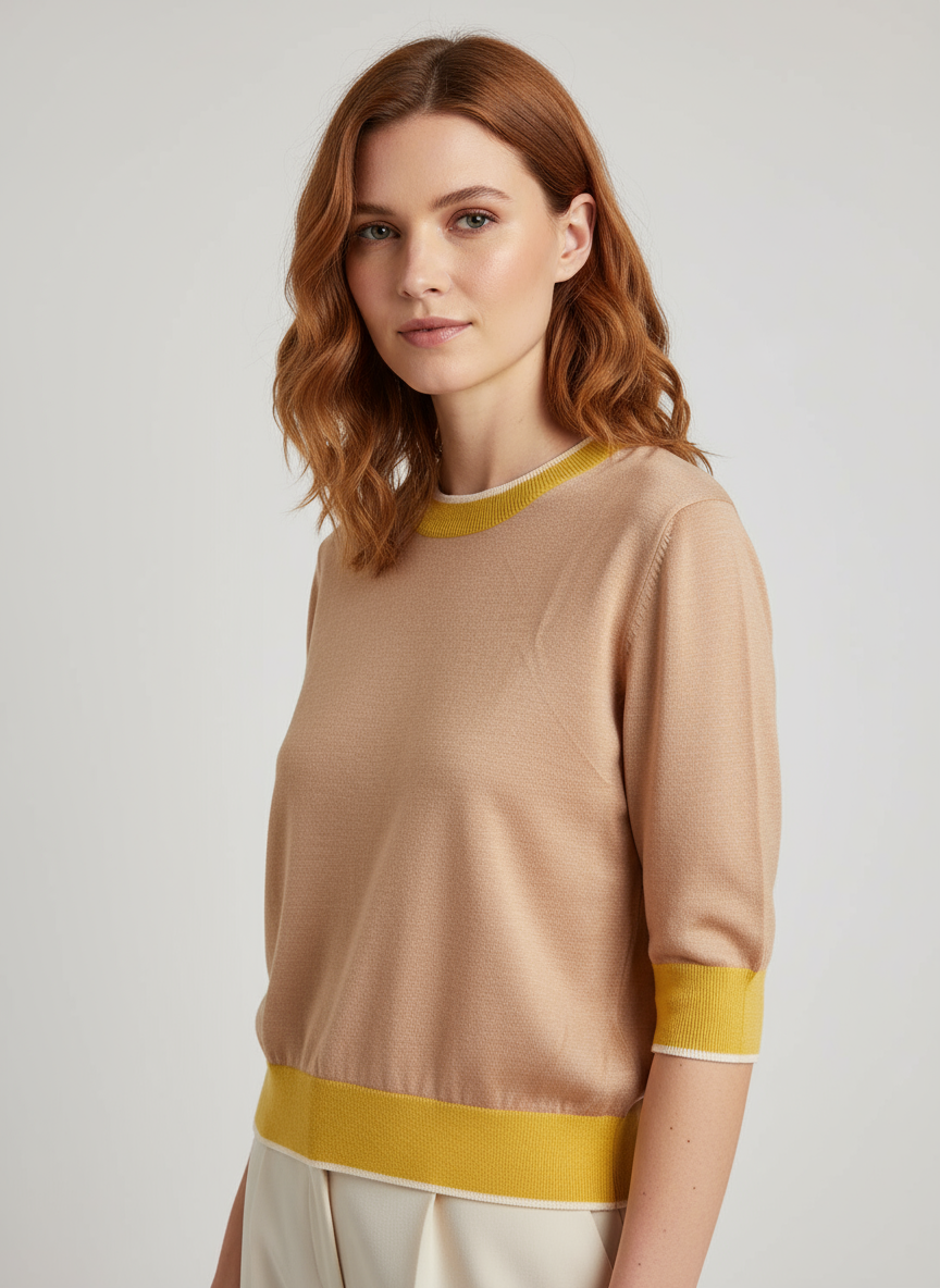 Jersey de 100% lana merino en tono caramelo, con delicados bordes amarillos que aportan un contraste sutil y sofisticado. De corte clásico y cuello redondo, combina calidez, suavidad y un estilo atemporal.