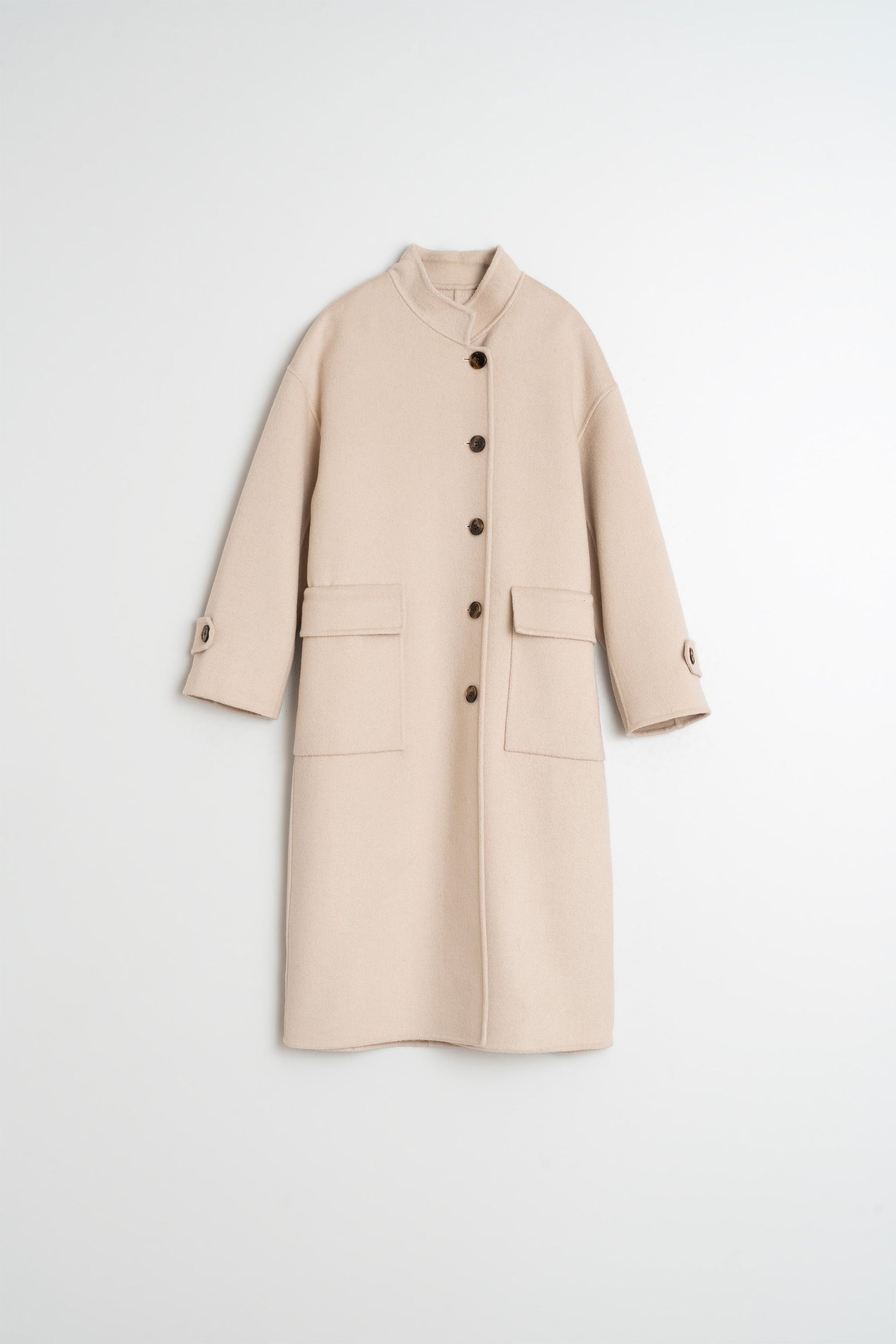 Maxi abrigo de lana, tiene hombro caĂdo y cierre abotonado en la parte frontal. Tiene maxi bolsillos de parche con tapeta y fit recto que hará que no te lo quieras quitar en toda la temporada.