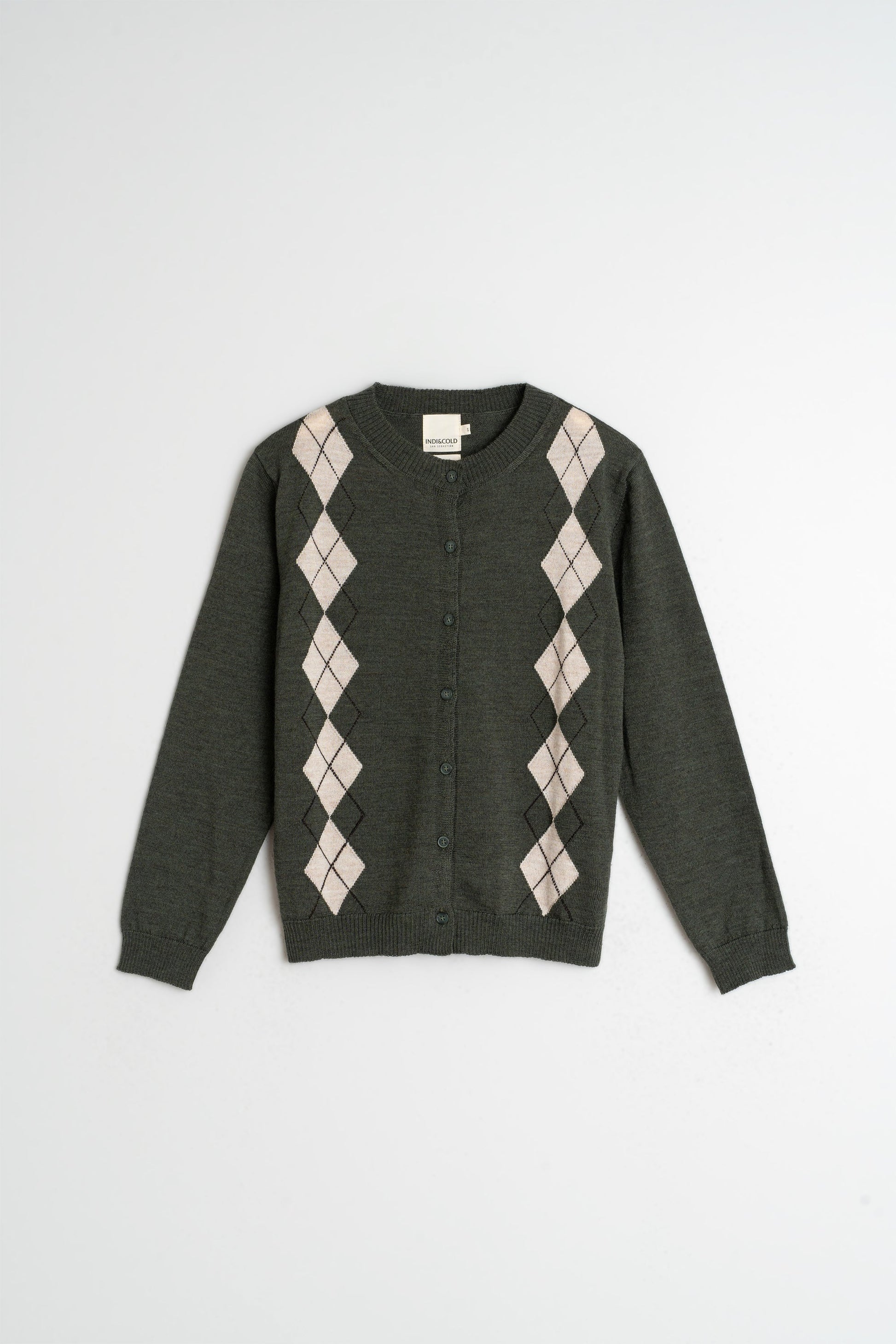 Cárdigan 100% lana merino, distinguido por sus refinados motivo de rombos. Una prenda ligera y atemporal, perfecta para quienes buscan la suavidad y el confort de la lana merino en un cardigan versátil de alta calidad.