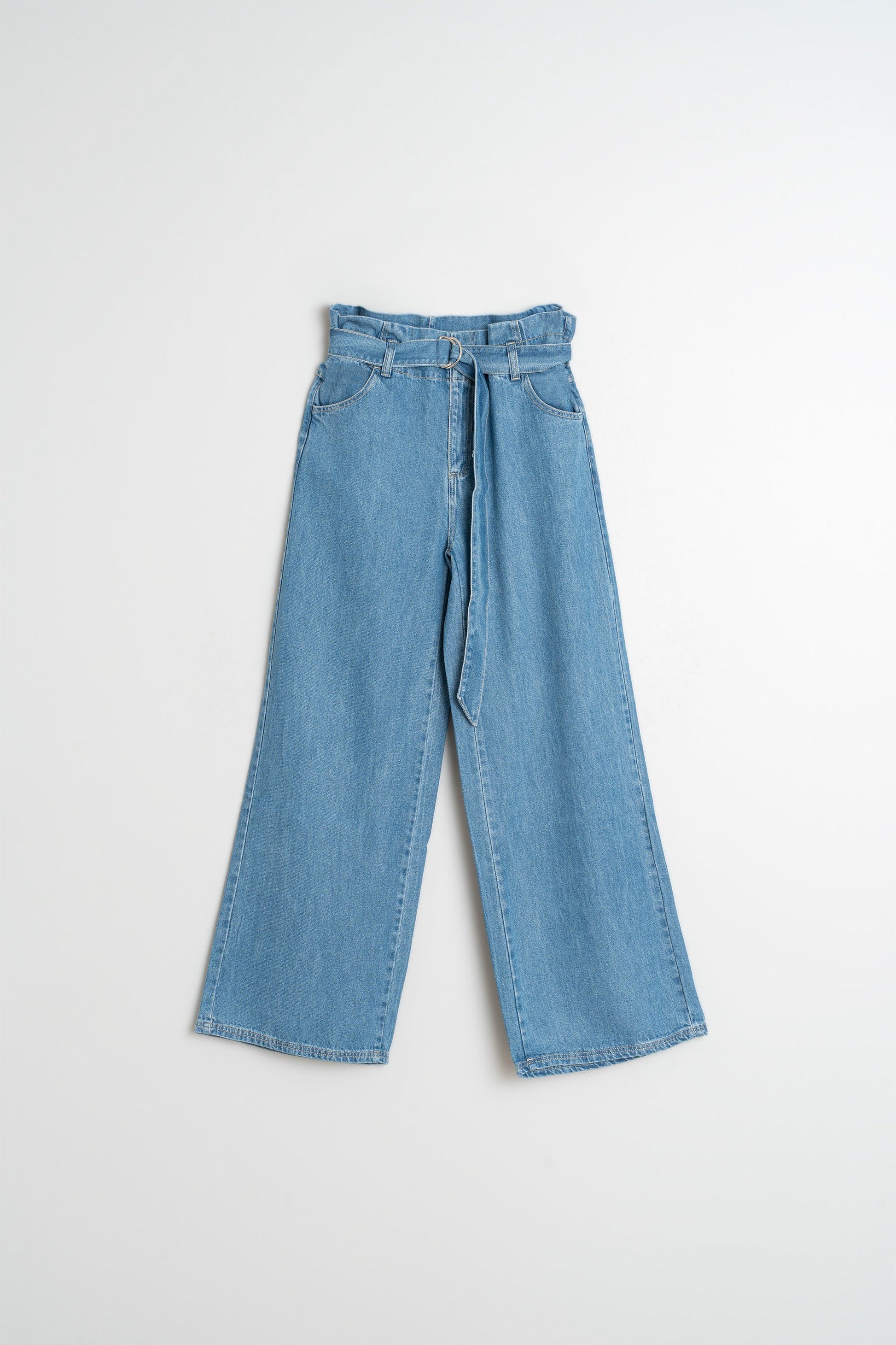 Pantalón de estilo relajado, con cintura engomada y ajustable mediante cinturón haciendo una cintura con ligeros volantes en la parte superior. Es tejido denim de lyocell que le da caída a la prenda.
