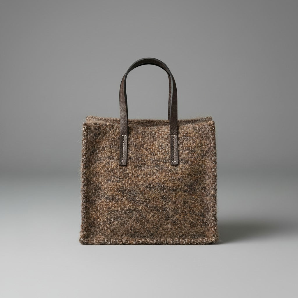 Bolso en tejido bouclé jaspeado en tonos tierra, con una textura cálida y artesanal que le da carácter. Incluye asas de mano en cuero oscuro y una correa adicional larga para llevarlo al hombro o cruzado, combinando funcionalidad y estilo contemporáneo.