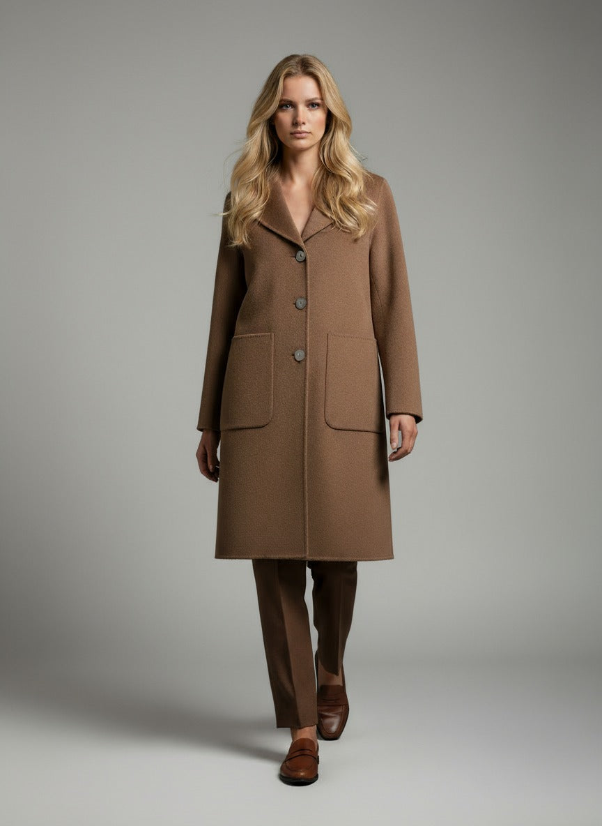 Por encima de la rodilla, con una línea recta y hombro ligeramente caído, este abrigo de corte regular es una pequeña joya de versatilidad. Cuello con solapa cerrado por tres botones - cubiertos por un lado, de imitación cuerno por el otro - y bolsillos de parche acabados con costura AMF. Elegancia en dos frentes, para acompañarte en todas partes.