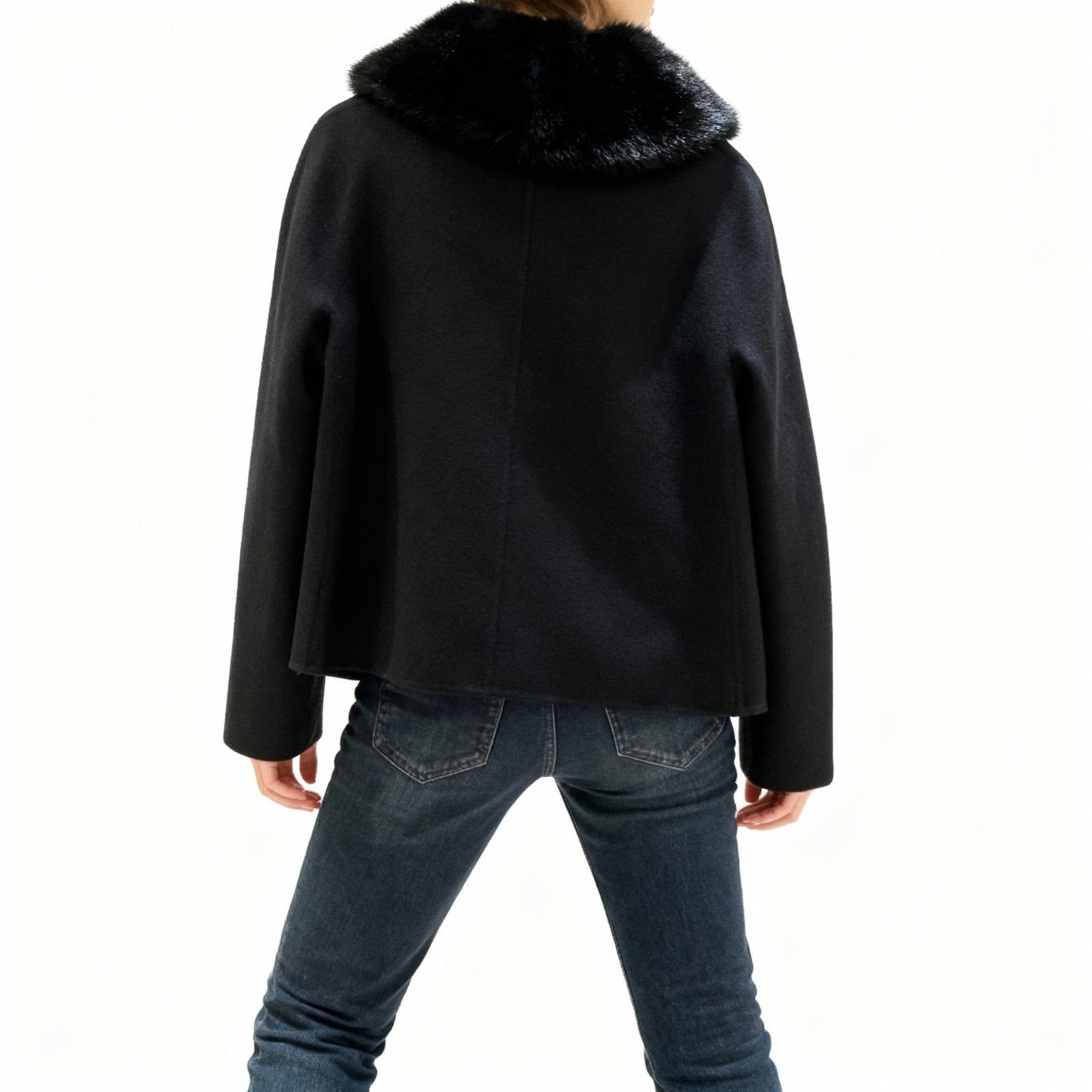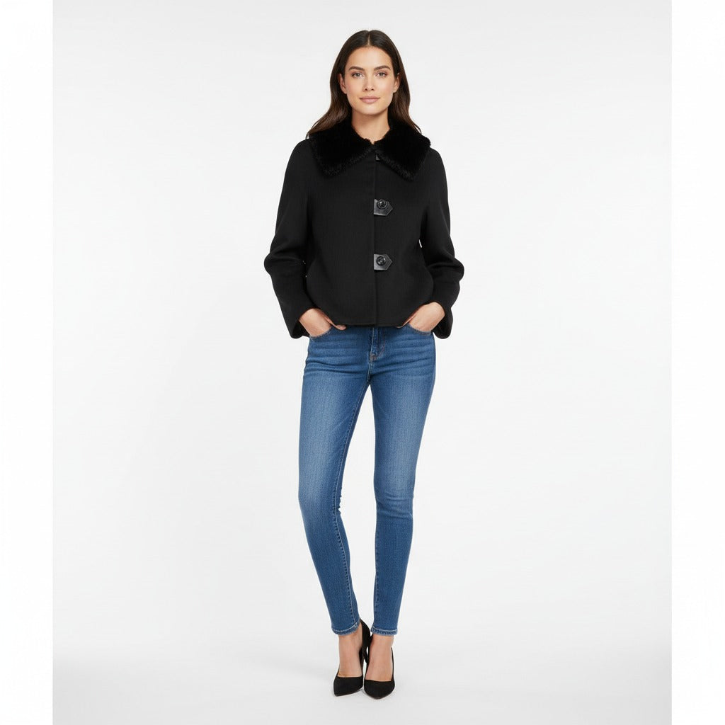 Abrigo corto con bolsillos y pelo en cuello.