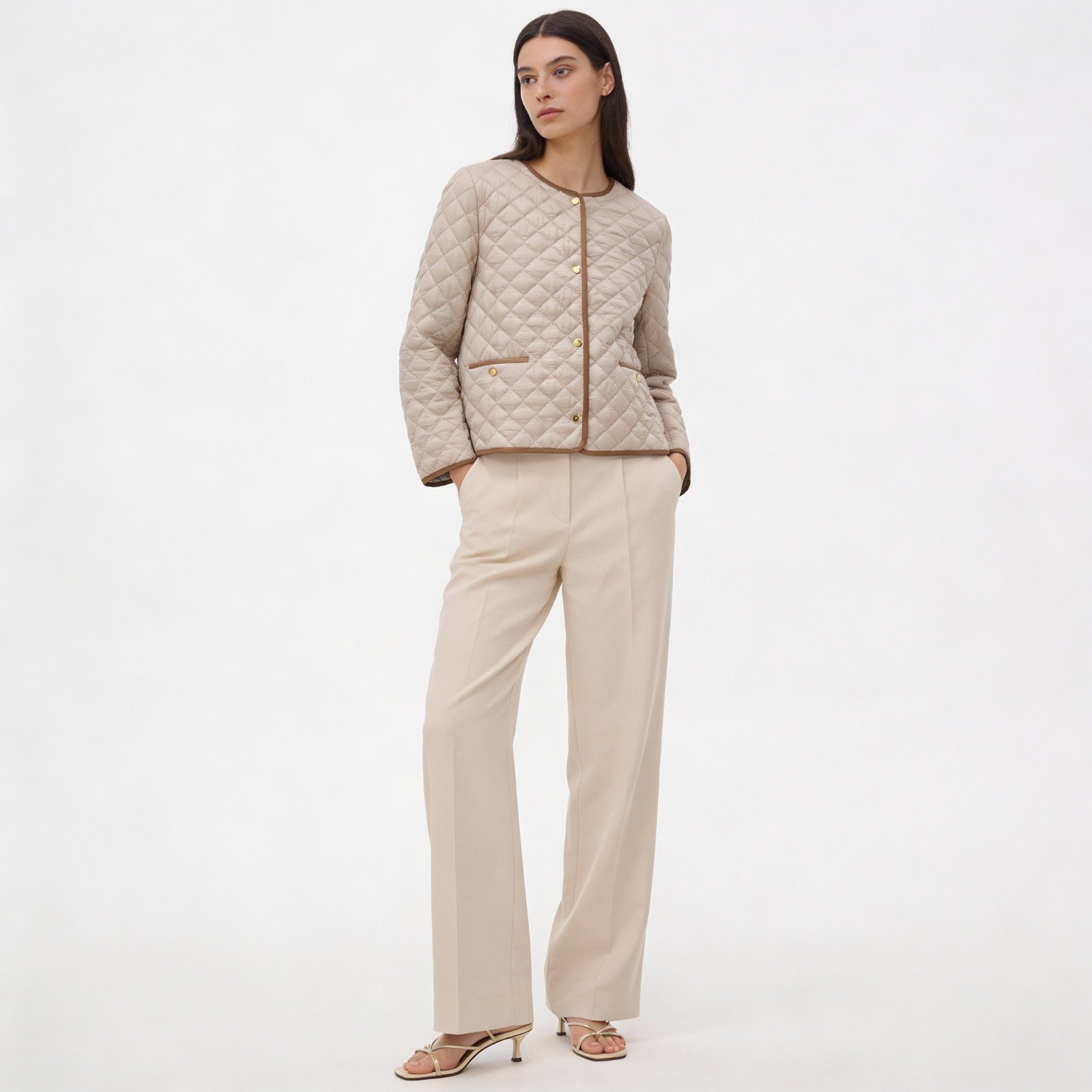 Chaqueta corta acolchada, cuello redondo y bolsillos delanteros.