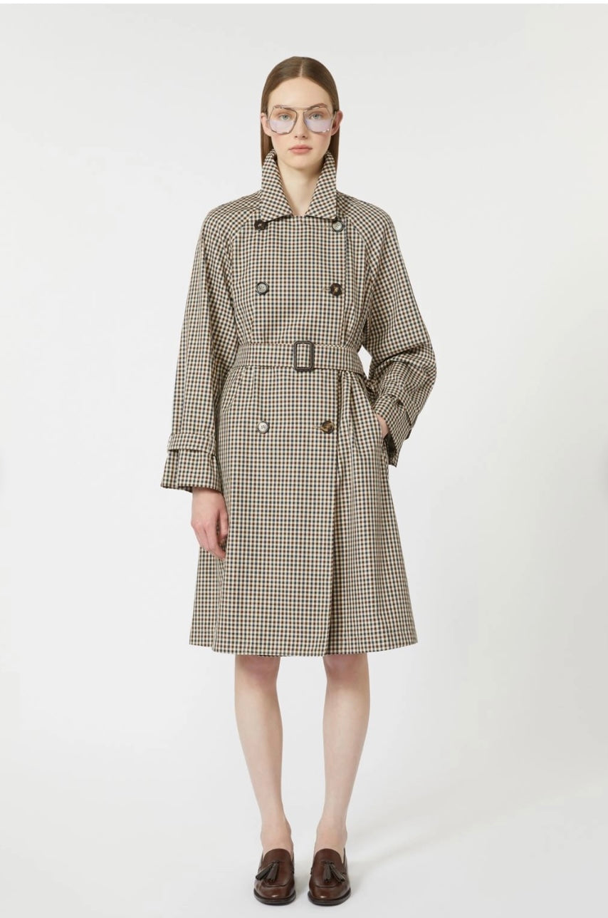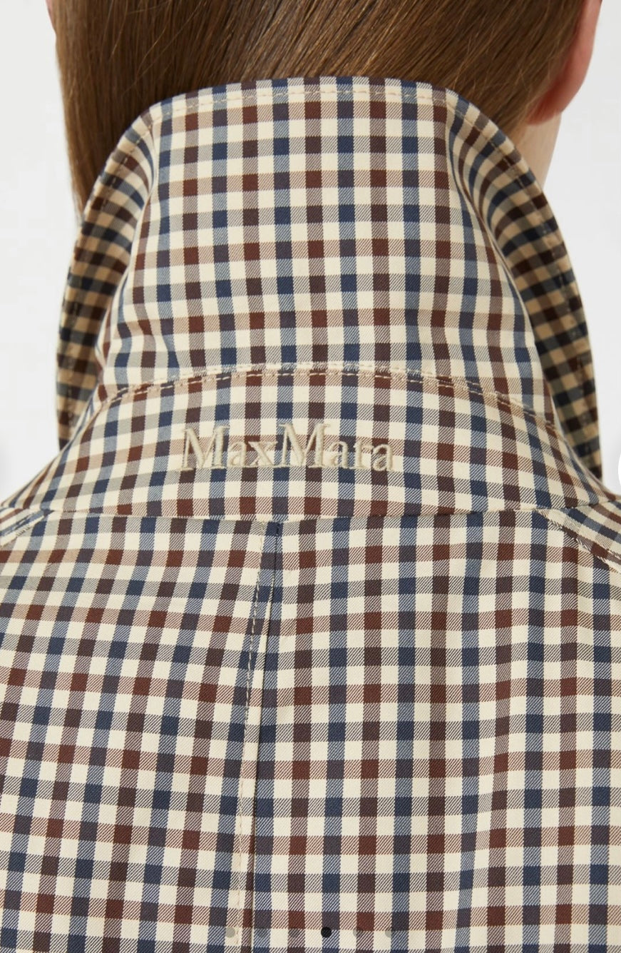 Gabardina midi con cierre cruzado de doble botĂłn, acabada con fantasĂa a cuadros y logotipo Max Mara bordado en el bajocuello.