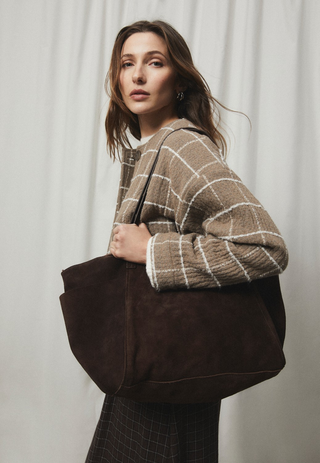 Bolso shopper de ante. Cierre mediante cremallera metálica.. Bolsillos exteriores en cada lateral. Medidas: 55cm de largo, 32cm de alto, 18cm de ancho.