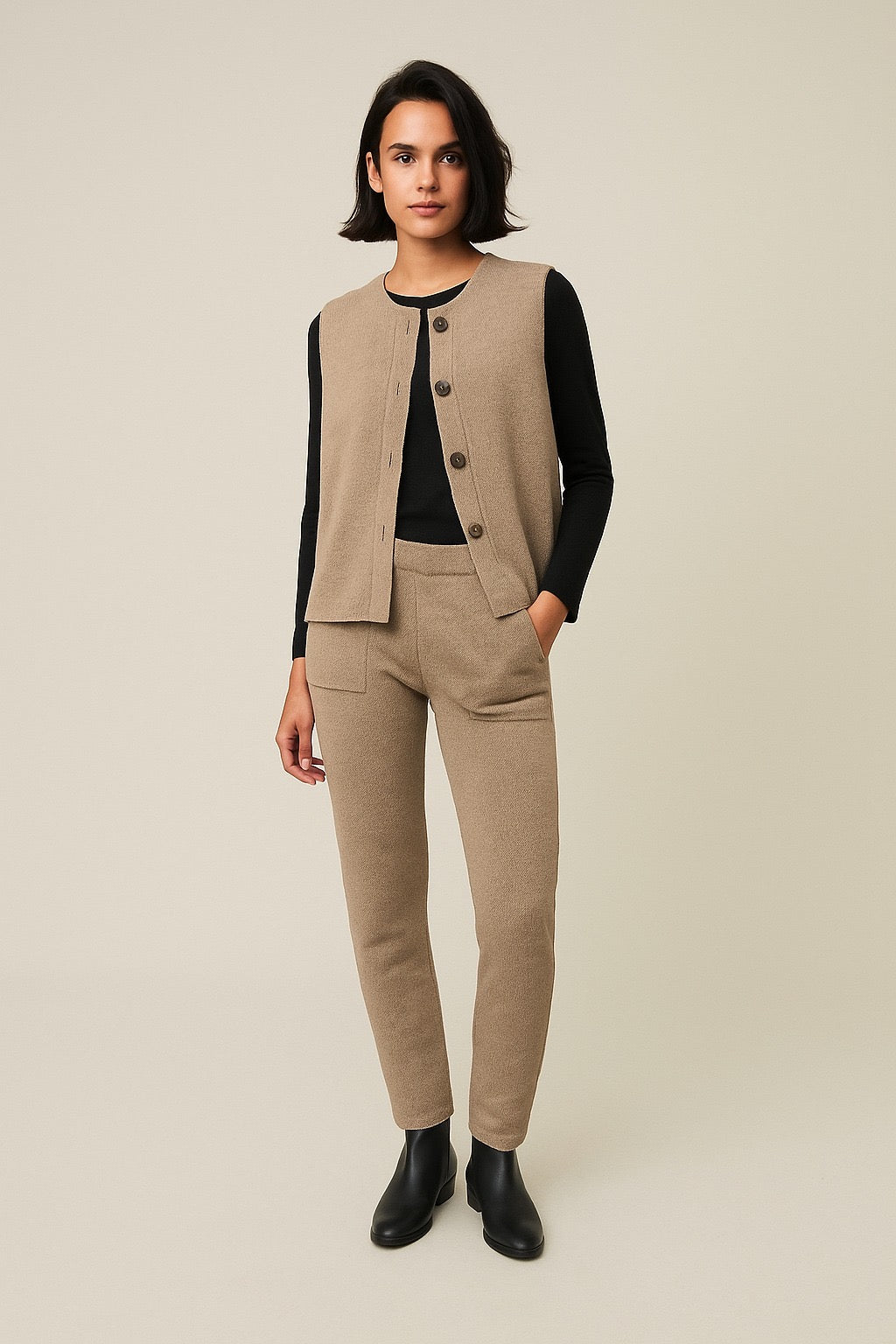 Chaleco confeccionado en un tejido rústico con abotonadura central.