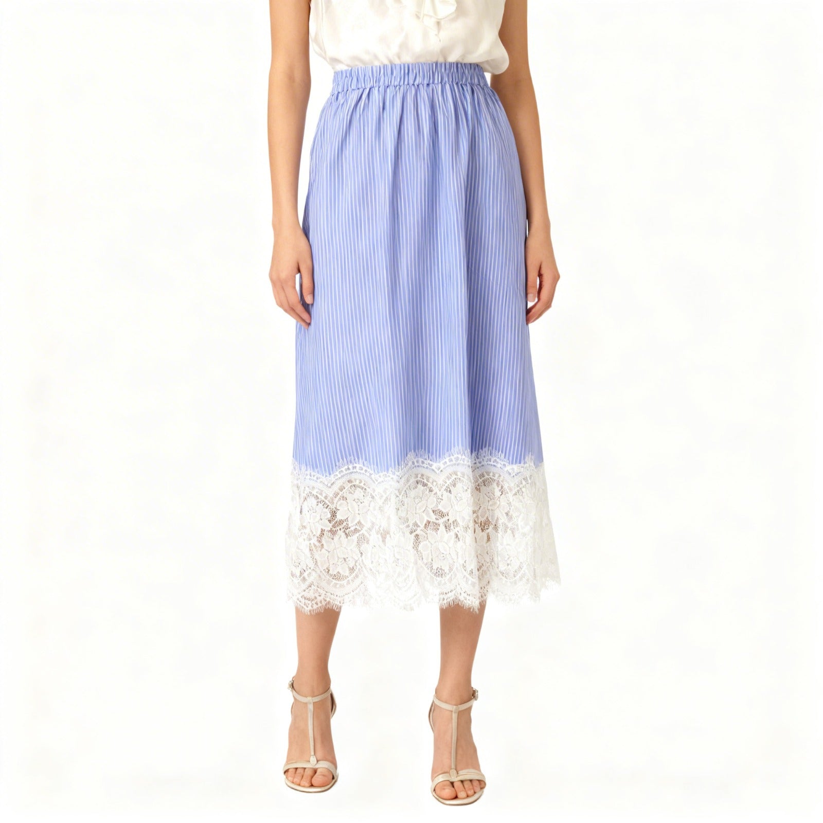 Falda estampada rayas con goma en cintura y puntilla parte inferior.