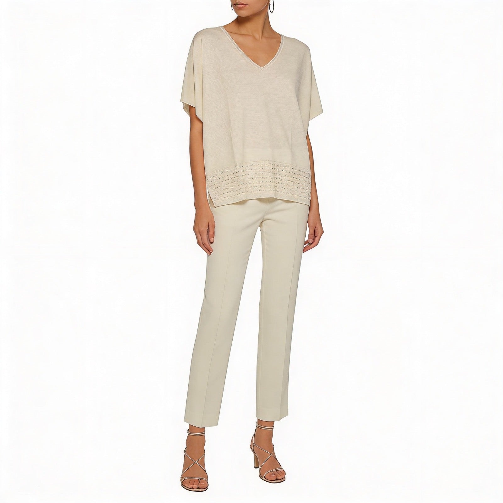 Jersey ancho, manga murciélago y parte inferior crochet.