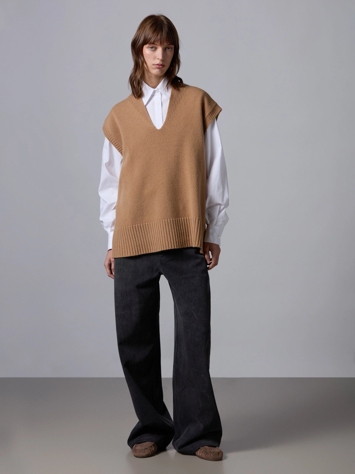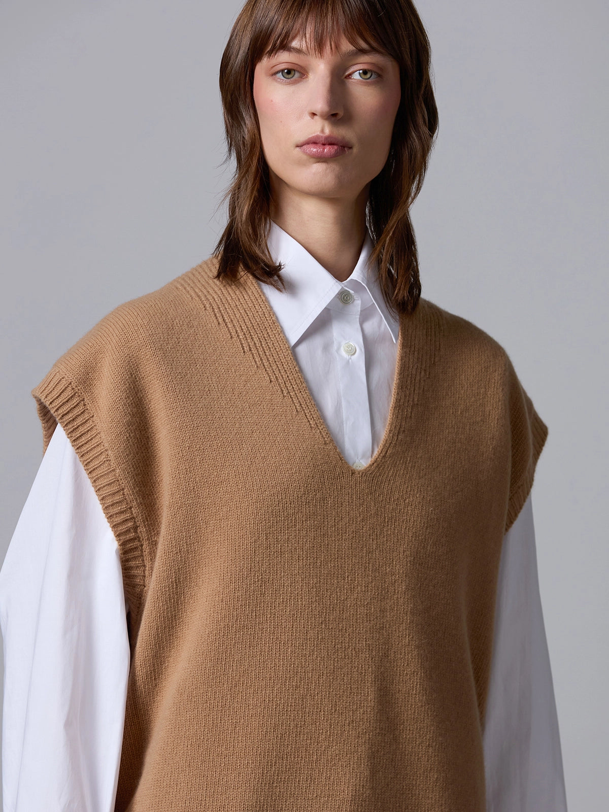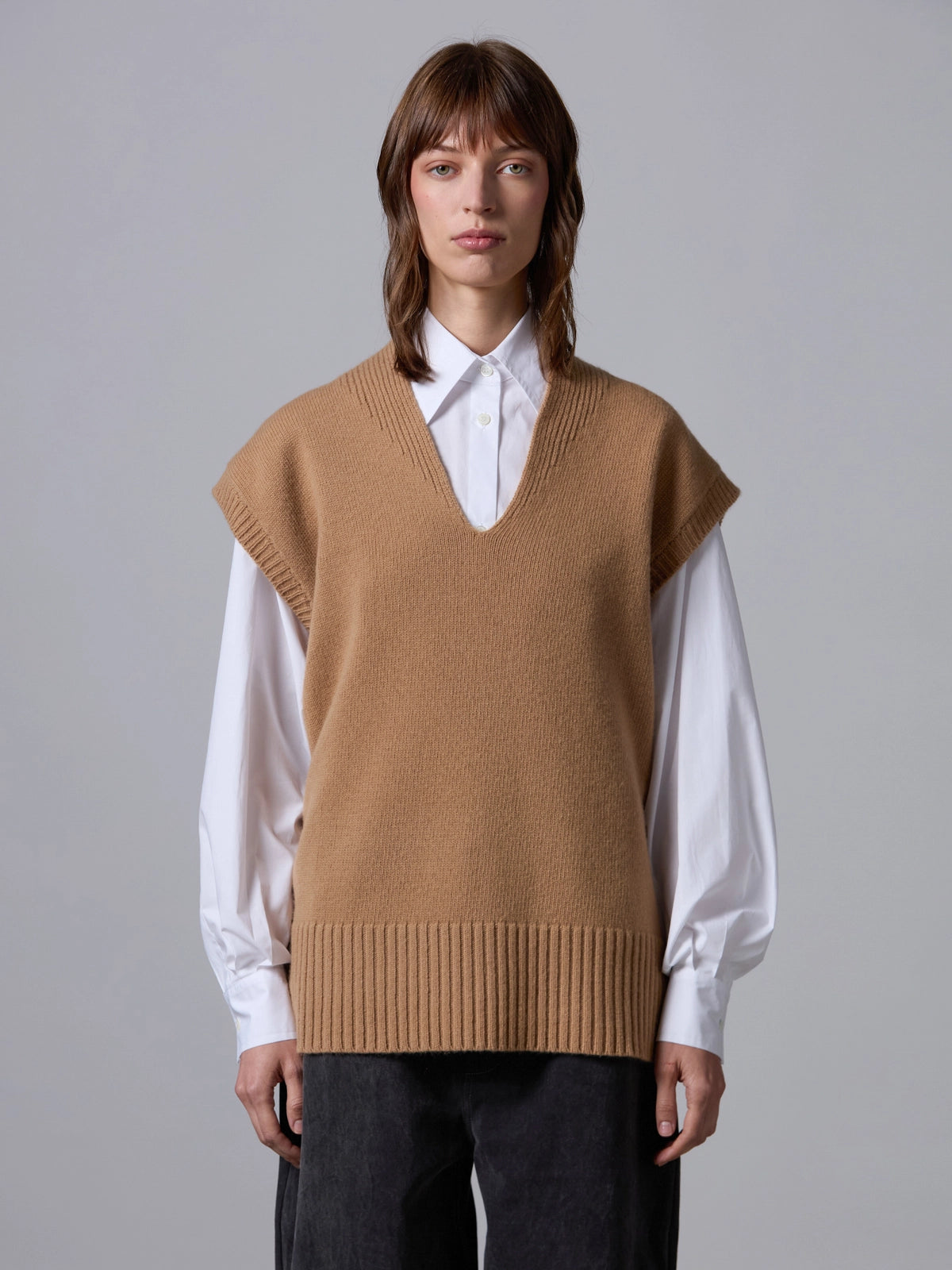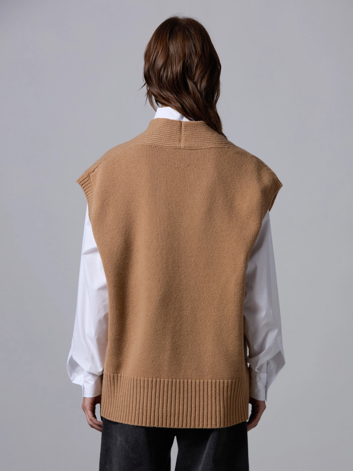 Chaleco tipo slipover de ajuste relajado, confeccionado en suave lana de alta calidad. Presenta un escote en V profundo y acabados acanalados que aportan textura y estructura al diseño. Una prenda versátil y elegante, perfecta para superponer sobre camisas o camisetas ligeras.