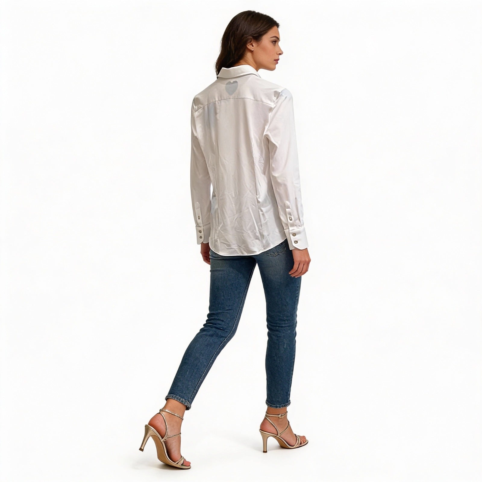 Camisa blanca, entallada, botones vistos.