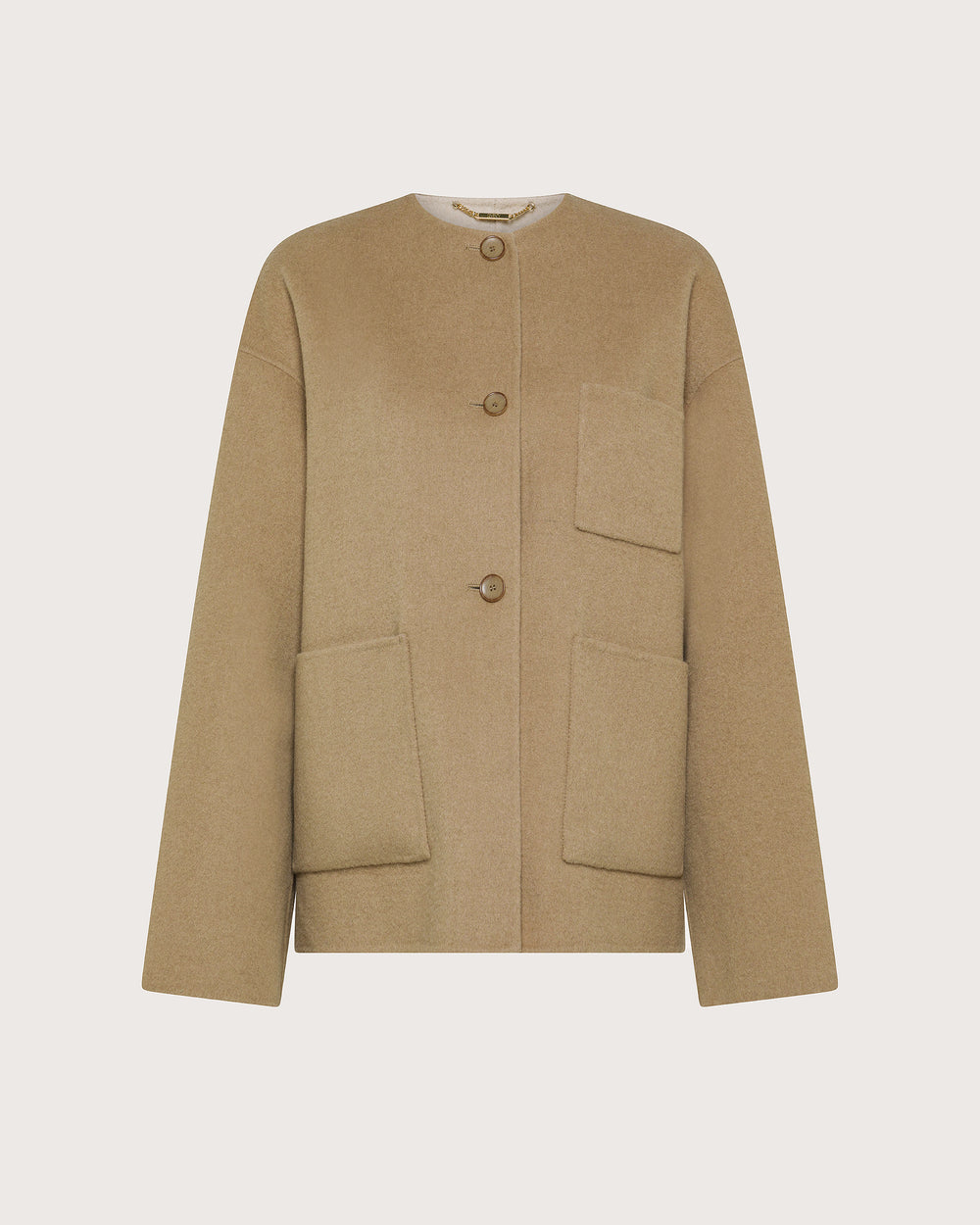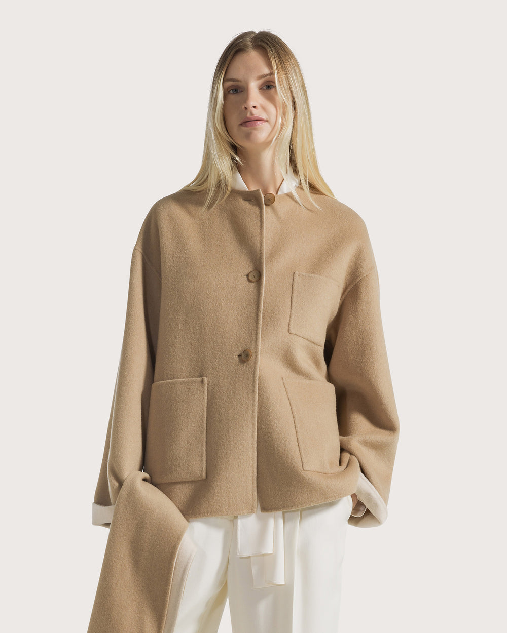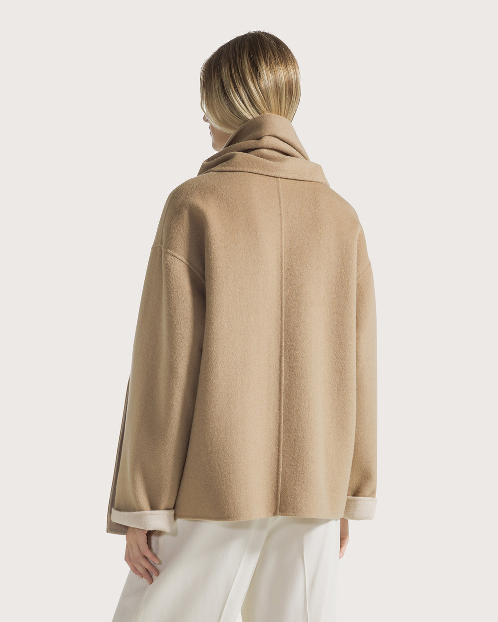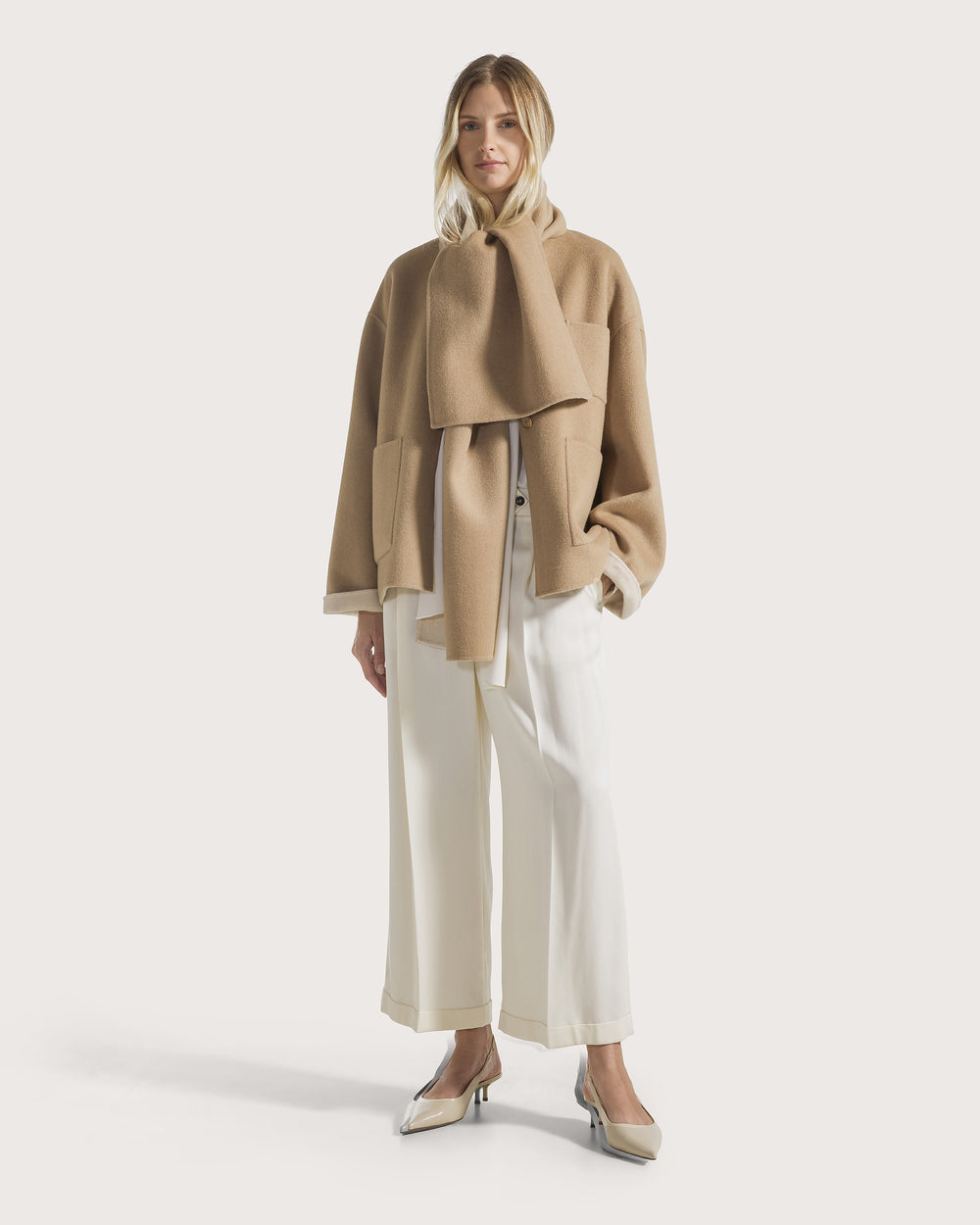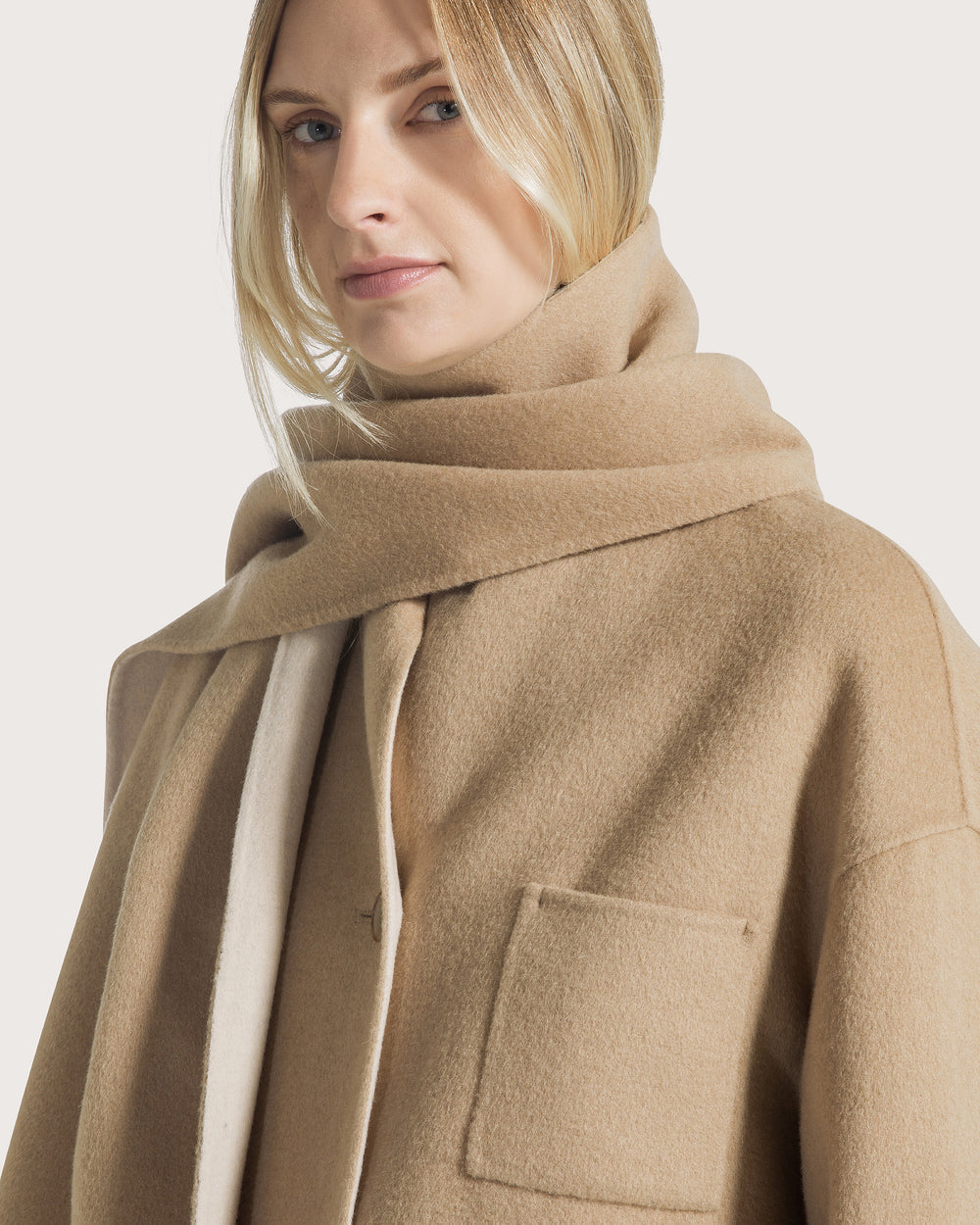 Abrigo corto de lana mezclada con doble mezcla y bufanda. Dos bolsillos delanteros.