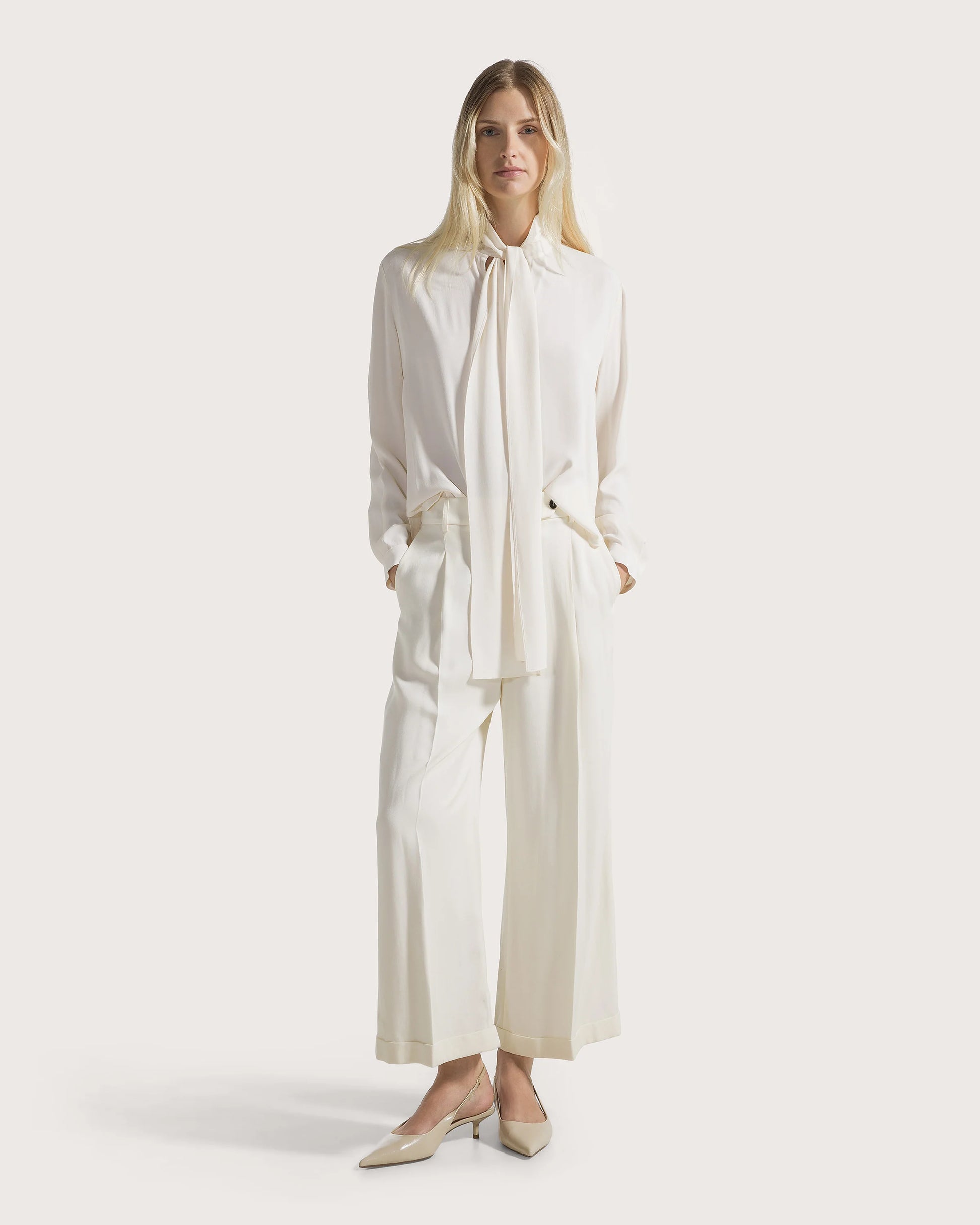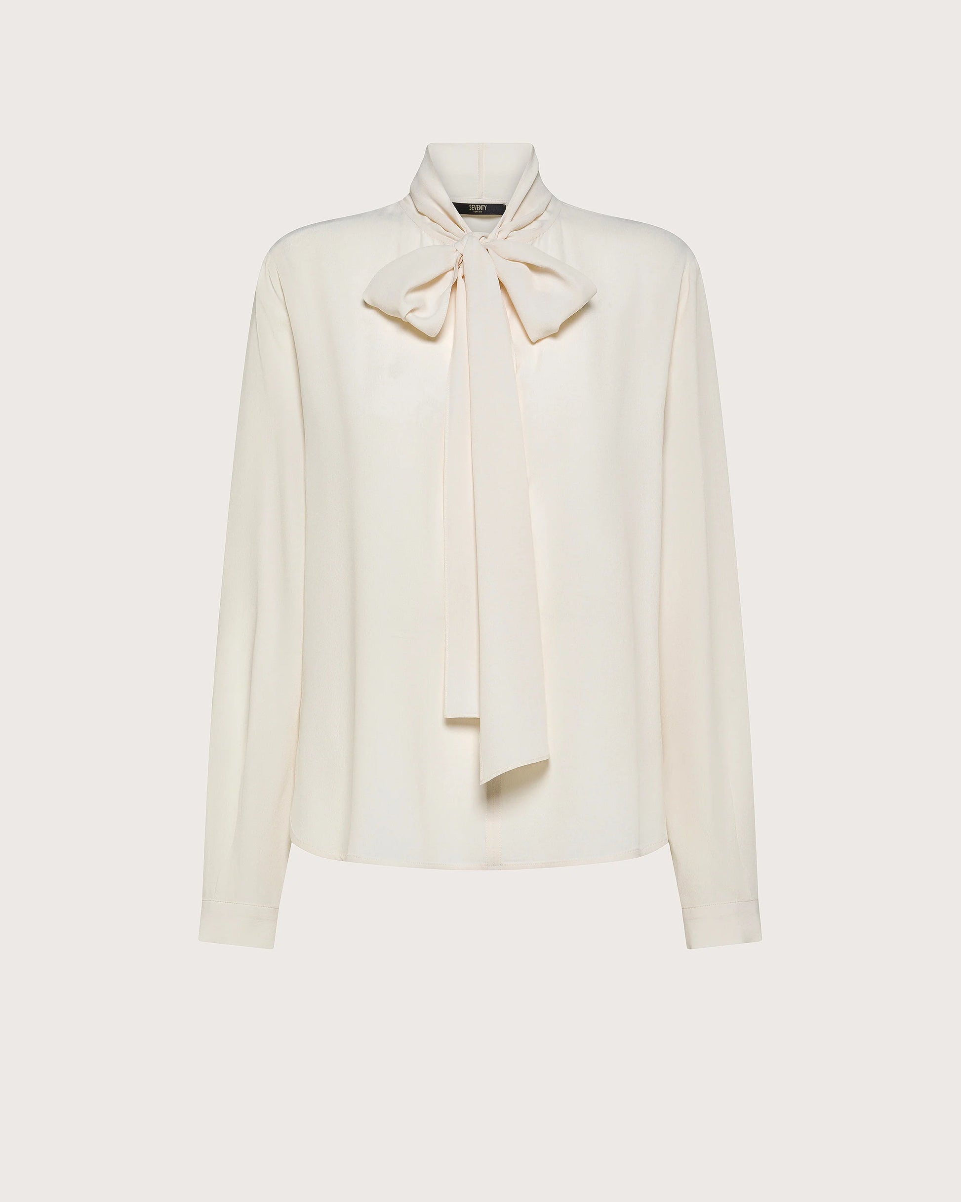 Blusa de crepé de mezcla de seda lisa de color beige claro con lazo en el cuello.