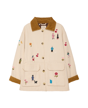 La chaqueta Cara tiene un corte holgado con hombros caídos y está confeccionada en sarga de algodón 100 % orgánico. El cuello y el interior de los bajos de las mangas están forrados con retales de pana en un color oscuro que contrasta, visible al remangarse. Cuenta con dos amplios bolsillos utilitarios con solapa, forrados con retales de pana, y un cordón ajustable en la cintura. La chaqueta está forrada con retales de algodón y presenta un estampado de lunares. Delicados motivos bordados se extienden por toda la chaqueta, narrando una historia vibrante, llena de alegría y vida.