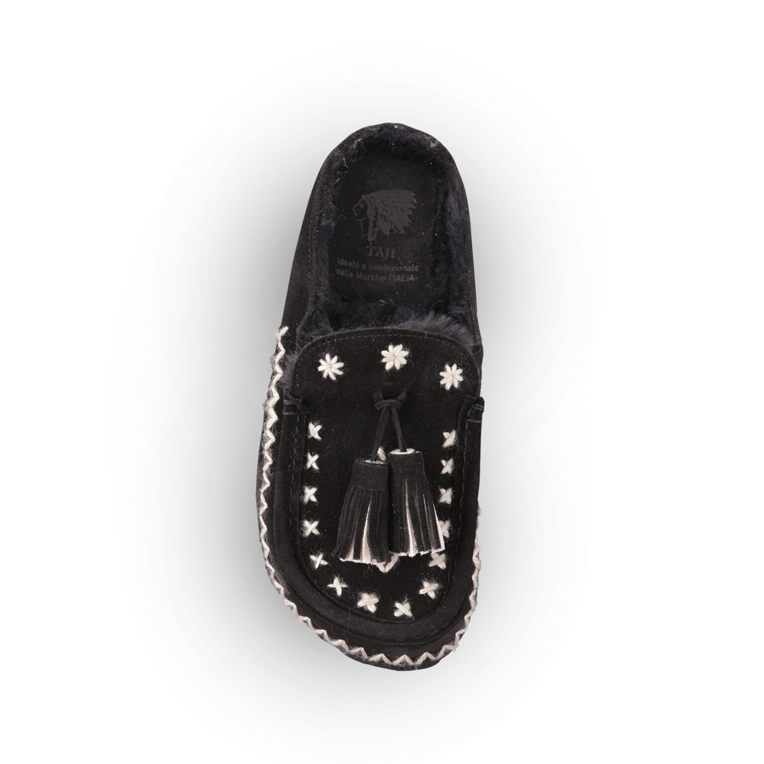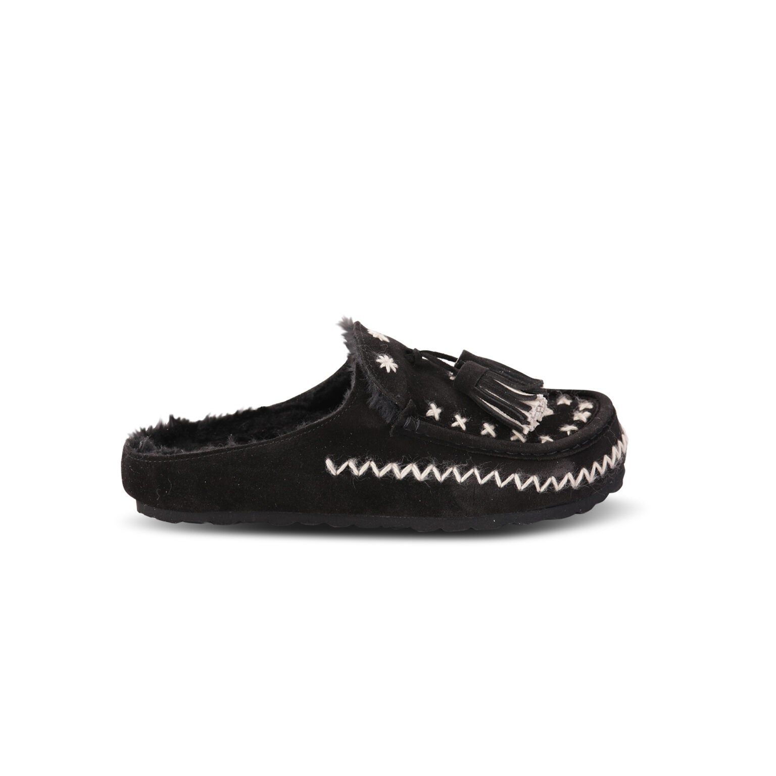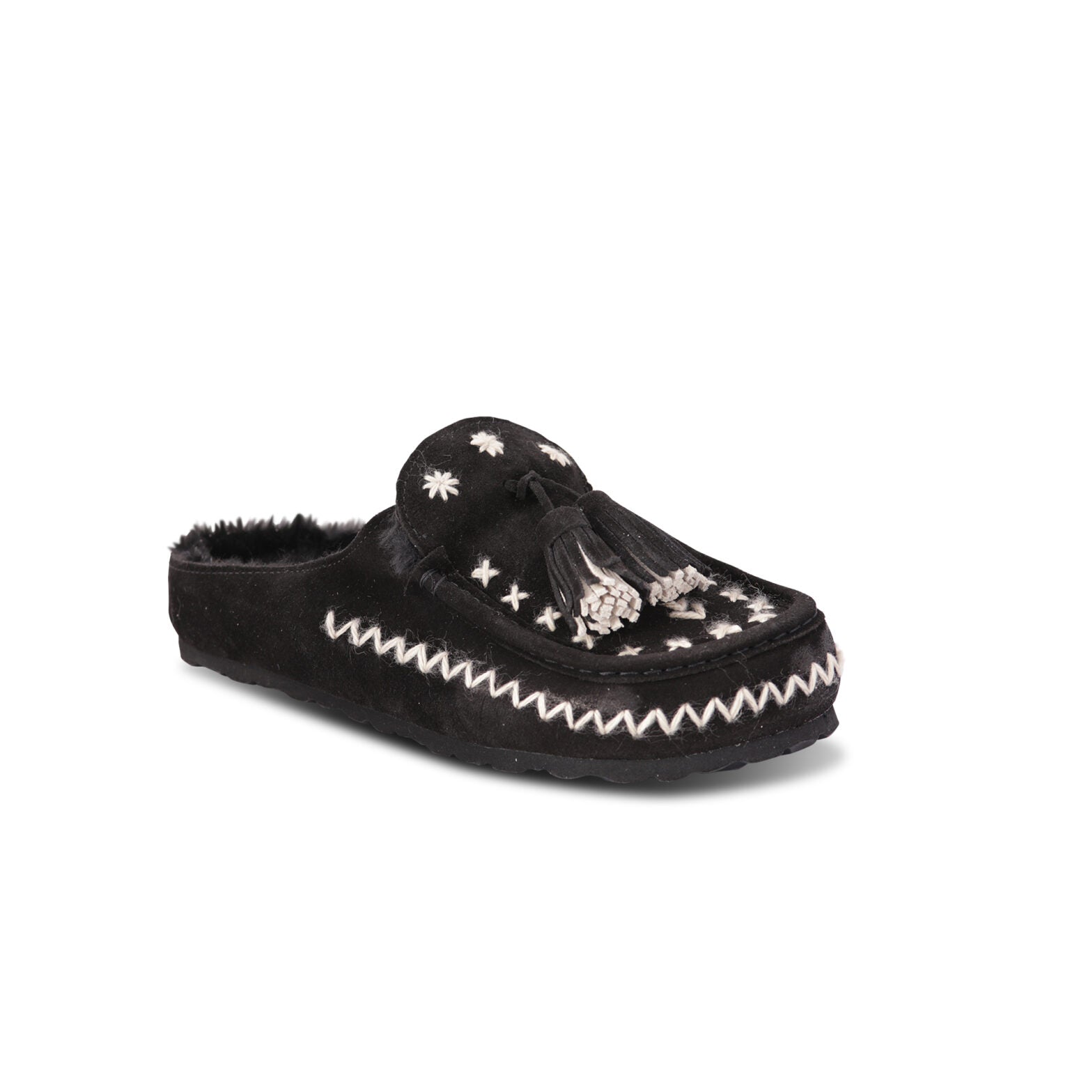 Zueco con borlas, suela anatómica forrada en piel sintética negra ecológica, parte superior con bordado de piel de becerro de ante negro.