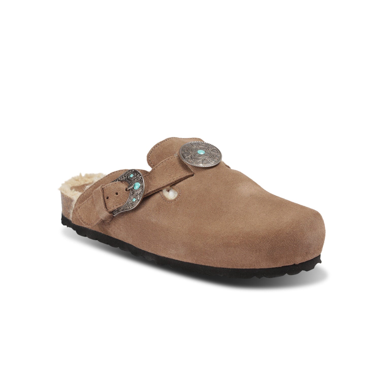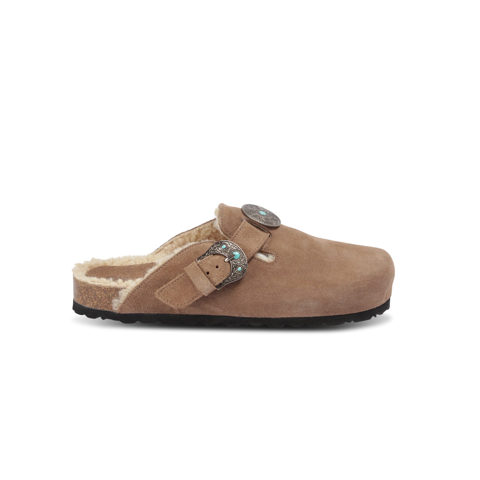 Zueco de una sola hebilla con piedra turquesa, suela anatómica forrada en piel sintética beige, parte superior en piel de becerro de ante color visón.