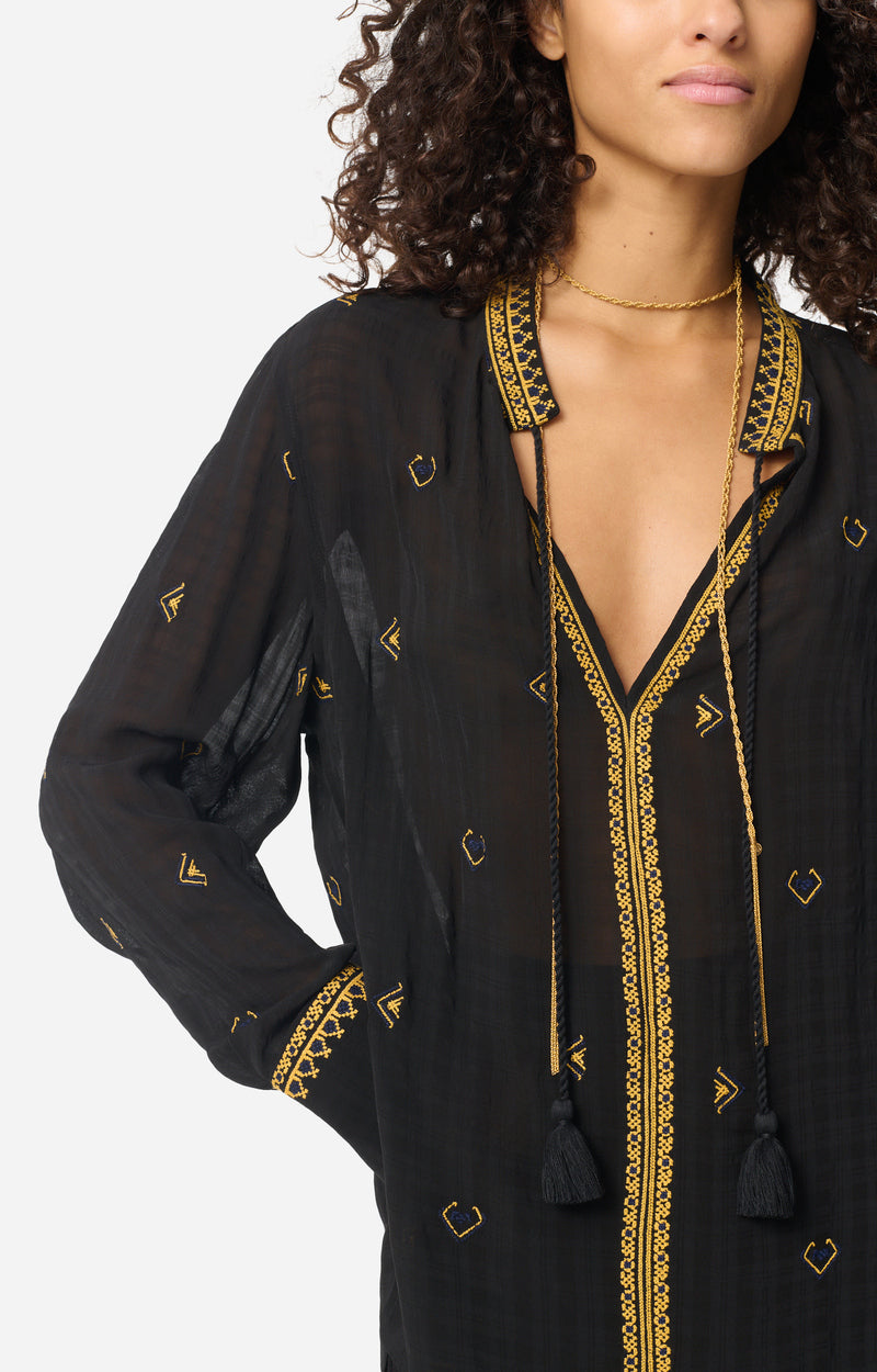 La blusa Gaspard destaca por su corte recto y su espĂritu bohemio con un toque casual.