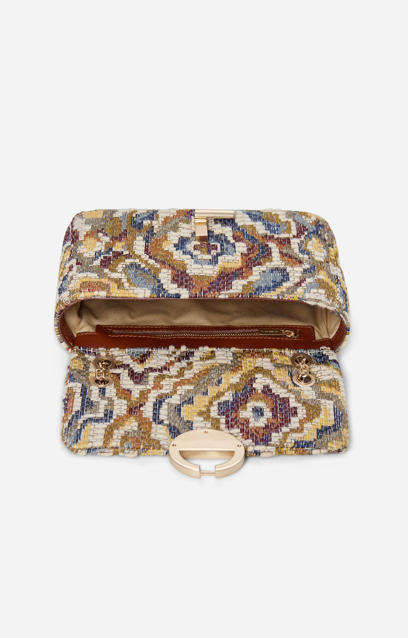 Un bolso Moon vibrante en lona jacquard, concebido como una pieza statement que transforma un atuendo.