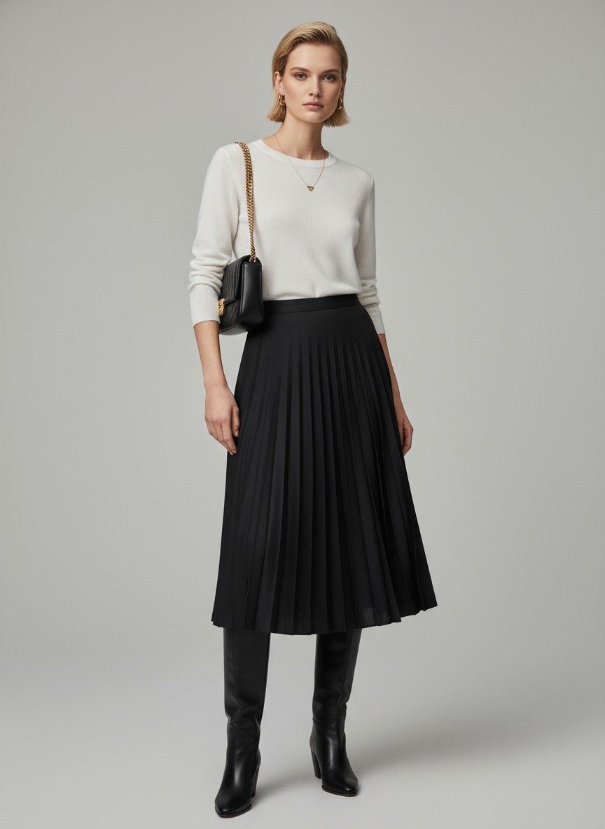 Sofisticada, versátil y eternamente elegante. Esta falda midi negra con pliegues definidos aporta movimiento y fluidez a cada paso. Su diseño de talle alto estiliza la figura, mientras que su caĂda impecable la convierte en una pieza clave tanto para looks de oficina como para ocasiones más formales. CombĂnala con blusas, jersĂ©is o tops ajustados para un estilo pulido y femenino.
