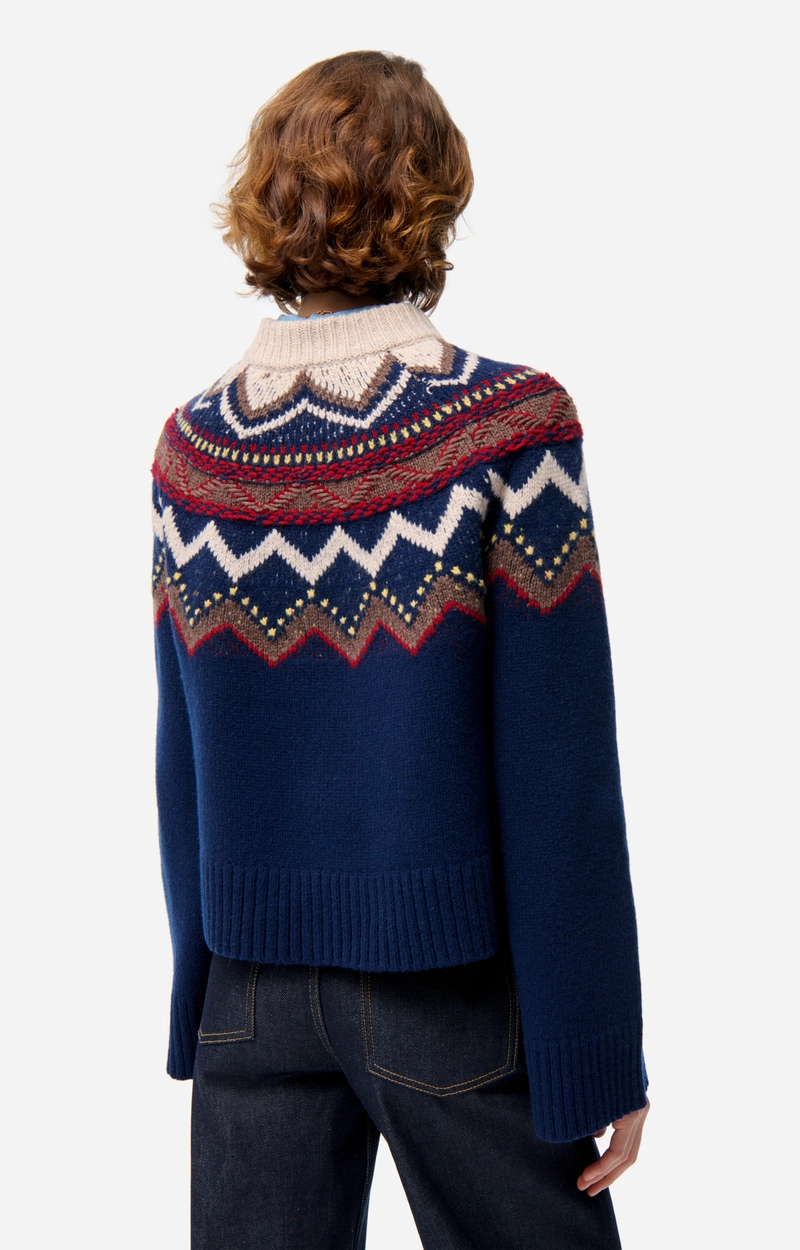 Este jersey de punto luce un gran y colorido estampado jacquard en el cuello, en tonos intensos y contrastantes. Un clásico de temporada reinventado con un corte recto que facilita su combinación con otras prendas.