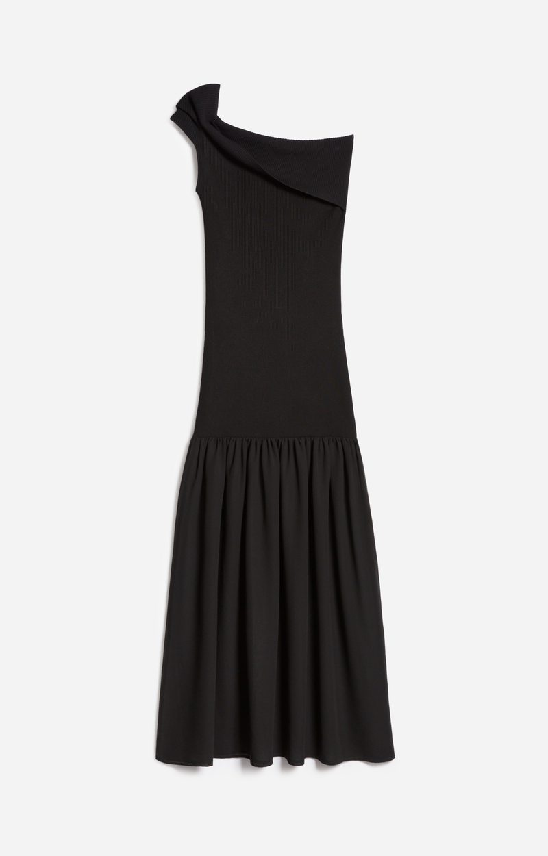 Un vestido de feminidad escultural que combina punto acanalado y tejido transparente en una silueta atrevida y sensual.