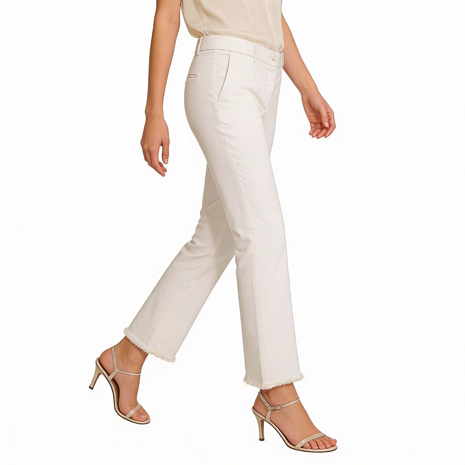 Pantalón tobillero deshilachado parte inferior y bolsillos.