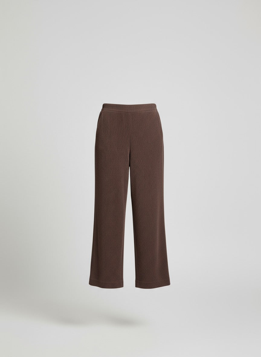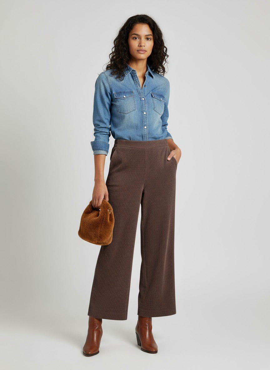 Pantalón de corte recto y tiro alto, con cintura elástica confeccionado en tejido con textura de pana.Suave, cómodo y elegante, ideal para un look casual o sofisticado.